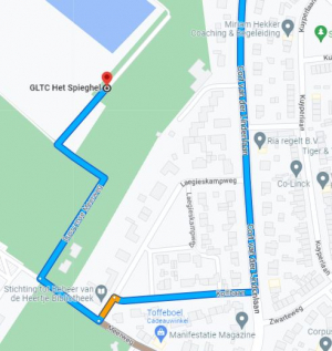 Komende vanuit de richting Amsterdam: Sla de weg vóór de Gooische Hockeyclub rechtsaf (klein weggetje), rijd deze uit, ga met de bocht mee naar links en dan naar rechts en je vindt de ingang van de club aan je rechterhand. LET OP bij gebruik van navigatie: voer als locatie GLTC Het Spieghel in en niet het adres!